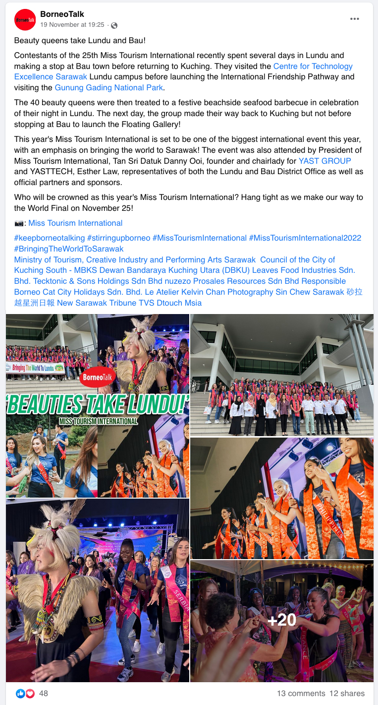 Published by www.facebook.com/BorneoTalk on 19 NOV 2022. Read on online, please Click Here ! Category: NewsNovember 19, 2022Post navigationPreviousPrevious post:BorneoTalk : “Friendship & Unity!”NextNext post:BorneoTalk : A Lesson in NumbersRelated PostsMiss Tourism International Crowns Its New Queens For 2025/26!October 20, 2025Miss Tourism International 2025 to Shine Bright in MalaysiaOctober 8, 2025MTI 2025 : Press Conference (on Sin Chew Daily)October 8, 2025Voting Now Open for Miss Dreamgirl of the Year International 2025/26September 19, 2025Miss Tourism International 2025 : A World of Beauty and Culture in MalaysiaSeptember 18, 2025Malaysia to Host MTI 2025 at Resorts World Genting this OctoberSeptember 2, 2025