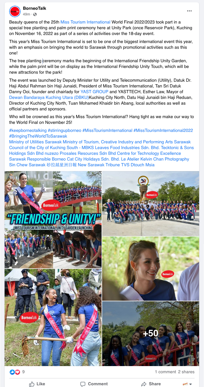 Published by www.facebook.com/BorneoTalk on 16 NOV 2022.Read on online, please Click Here ! Category: NewsNovember 16, 2022Post navigationPreviousPrevious post:BorneoTalk : “Beauty-Ful Evening!”NextNext post:BorneoTalk : Beauties Take Lundu!Related PostsMiss Tourism International Crowns Its New Queens For 2025/26!October 20, 2025Miss Tourism International 2025 to Shine Bright in MalaysiaOctober 8, 2025MTI 2025 : Press Conference (on Sin Chew Daily)October 8, 2025Voting Now Open for Miss Dreamgirl of the Year International 2025/26September 19, 2025Miss Tourism International 2025 : A World of Beauty and Culture in MalaysiaSeptember 18, 2025Malaysia to Host MTI 2025 at Resorts World Genting this OctoberSeptember 2, 2025