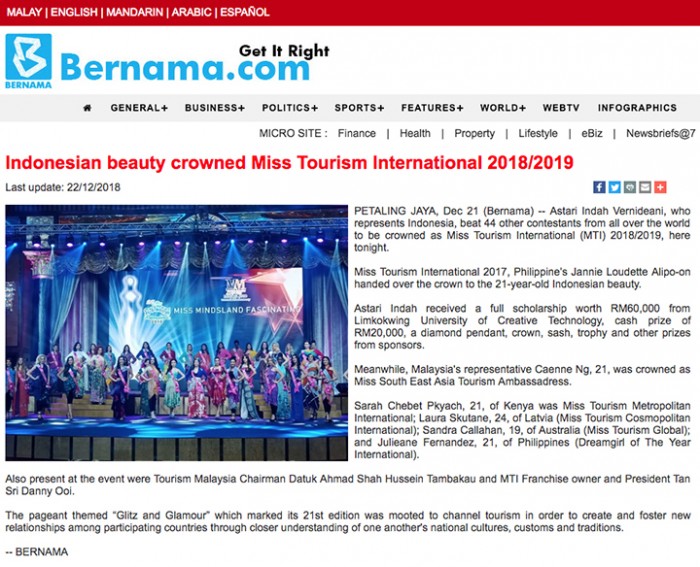 Published by bernama.com on 22 Dec 2018. Read on online, please Click Here ! Categories: News, Online NewsDecember 26, 2018Tags: IndonesianMTI 2018Post navigationPreviousPrevious post:46 Countries to take part in MTI 2018 World FinalNextNext post:2018 Astari Indah wins Miss Tourism International pageantRelated PostsMiss Tourism International Crowns Its New Queens For 2025/26!October 20, 2025Miss Tourism International 2025 to Shine Bright in MalaysiaOctober 8, 2025MTI 2025 : Press Conference (on Sin Chew Daily)October 8, 2025Voting Now Open for Miss Dreamgirl of the Year International 2025/26September 19, 2025Miss Tourism International 2025 : A World of Beauty and Culture in MalaysiaSeptember 18, 2025Malaysia to Host MTI 2025 at Resorts World Genting this OctoberSeptember 2, 2025