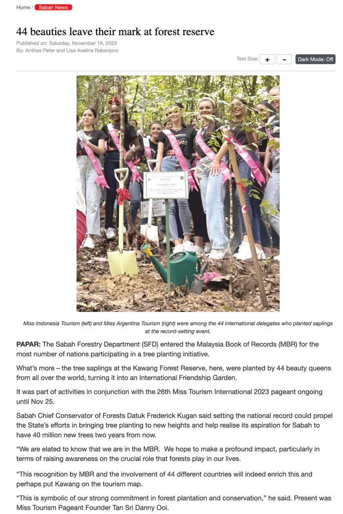 Published by dailyexpress.com.my on 18 NOV 2023. Read the FULL online news, please Click Here ! Categories: News, Online NewsNovember 19, 2023Post navigationPreviousPrevious post:MTI 2023 : Tree planting news in New Straits TimesNextNext post:MTI 2023 : Able to Generate Sabah’s Famous Economy in the Eyes of the WorldRelated PostsMiss Tourism International Crowns Its New Queens For 2025/26!October 20, 2025Miss Tourism International 2025 to Shine Bright in MalaysiaOctober 8, 2025MTI 2025 : Press Conference (on Sin Chew Daily)October 8, 2025Voting Now Open for Miss Dreamgirl of the Year International 2025/26September 19, 2025Miss Tourism International 2025 : A World of Beauty and Culture in MalaysiaSeptember 18, 2025Malaysia to Host MTI 2025 at Resorts World Genting this OctoberSeptember 2, 2025