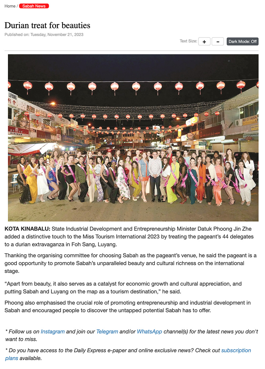 Published by dailyexpress.com.my on 21 NOV 2023. Read the online news, please Click Here ! Categories: News, Online NewsNovember 22, 2023Post navigationPreviousPrevious post:MTI 2023 : SICC plays host to Miss Tourism International delegatesNextNext post:MTI 2023 : Coral Planting news in The Borneo PostRelated PostsMiss Tourism International Crowns Its New Queens For 2025/26!October 20, 2025Miss Tourism International 2025 to Shine Bright in MalaysiaOctober 8, 2025MTI 2025 : Press Conference (on Sin Chew Daily)October 8, 2025Voting Now Open for Miss Dreamgirl of the Year International 2025/26September 19, 2025Miss Tourism International 2025 : A World of Beauty and Culture in MalaysiaSeptember 18, 2025Malaysia to Host MTI 2025 at Resorts World Genting this OctoberSeptember 2, 2025