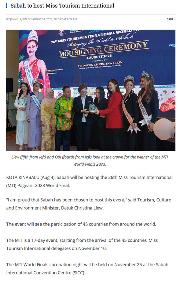 Published by theborneopost.com on 04 Aug 2023. Read on online, please Click Here ! Categories: News, Online NewsAugust 8, 2023Post navigationPreviousPrevious post:MTI 2023 : Hosting State – SabahNextNext post:MTI 2023 : Sabah to host Miss Tourism International pageant in NovemberRelated PostsMiss Tourism International Crowns Its New Queens For 2025/26!October 20, 2025Miss Tourism International 2025 to Shine Bright in MalaysiaOctober 8, 2025MTI 2025 : Press Conference (on Sin Chew Daily)October 8, 2025Voting Now Open for Miss Dreamgirl of the Year International 2025/26September 19, 2025Miss Tourism International 2025 : A World of Beauty and Culture in MalaysiaSeptember 18, 2025Malaysia to Host MTI 2025 at Resorts World Genting this OctoberSeptember 2, 2025
