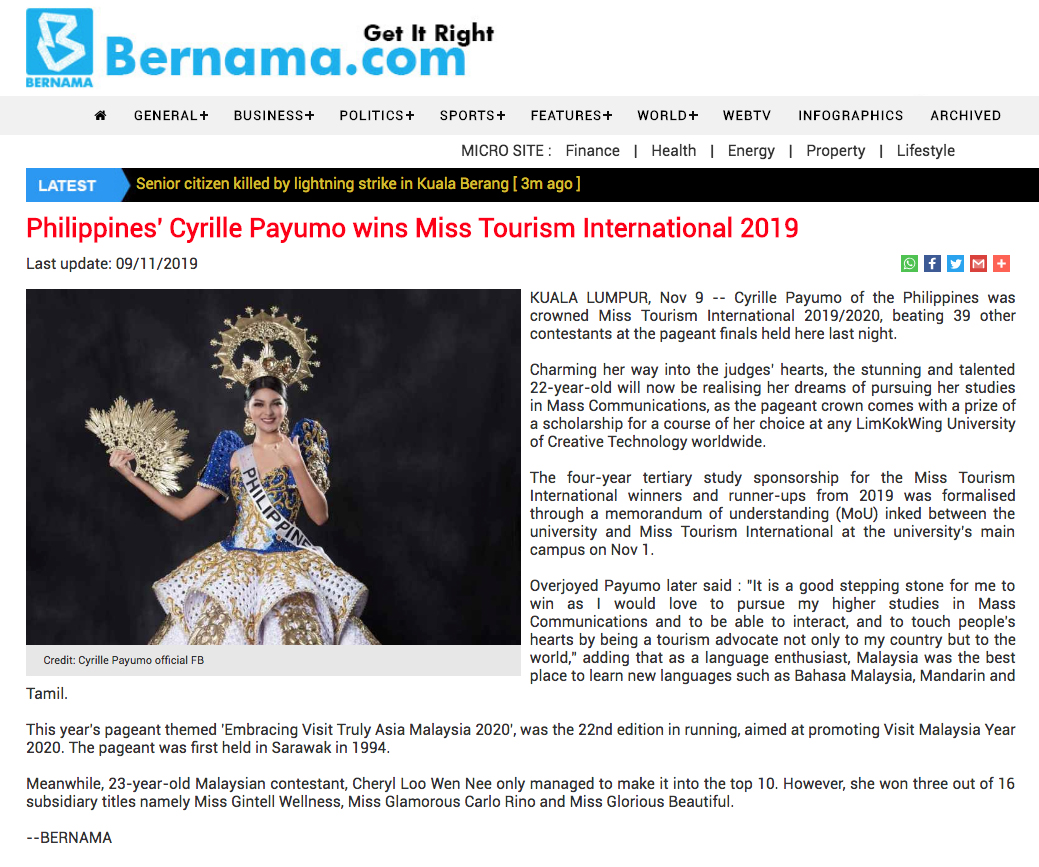 Published by bernama.com on 09 Nov 2019. Read on online, please Click Here ! Categories: News, Online NewsNovember 11, 2019Tags: Cyrille PayumoMTI 2019PhilippinesPost navigationPreviousPrevious post:Filipino Crowned Miss Tourism InternationalNextNext post:Cyrille Payumo pemenang ‘Miss Tourism International 2019’Related PostsMiss Tourism International Crowns Its New Queens For 2025/26!October 20, 2025Miss Tourism International 2025 to Shine Bright in MalaysiaOctober 8, 2025MTI 2025 : Press Conference (on Sin Chew Daily)October 8, 2025Voting Now Open for Miss Dreamgirl of the Year International 2025/26September 19, 2025Miss Tourism International 2025 : A World of Beauty and Culture in MalaysiaSeptember 18, 2025Malaysia to Host MTI 2025 at Resorts World Genting this OctoberSeptember 2, 2025